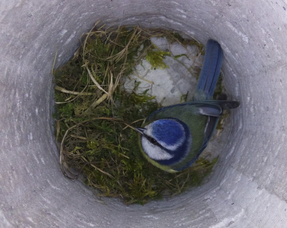 Update: You might recall that my BT first started bringing material into the box on 10th March, which is 4 weeks ago - and since then she has brought material in and taken most of it out again on an almost daily basis. I have no idea what is going on, but Benn's suggestion that she isn't ready but wants to keep the instinct going seems plausible. Anyway, today she started bringing in quite a bit more material than usual, and hasn't taken *that* much out - although she is still bringing bits in and out quite a lot. Still not 100% sure I guess whether she'll go for it, but I'm feeling more optimistic after today. Here she is this evening - this is the most material that has been in the box so far, so let's see what tomorrow brings..  The starling continues to visit and bring in the odd bit of material in the mornings, after having 2 weeks away. Today a female spent a bit of time at the entrance with the male inside, but was not convinced. It all seems to be getting a bit late, but I'm still hopeful something will happen here..