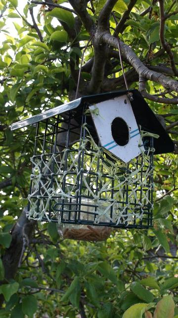 Anyway as well as using cable ties and garden wire to reduce the mesh size round the bottom half of the feeder (as advised by Paul initially) I have now cut a hole in the bottom of the feeder and fit into it an empty (!) 120g Yeo Valley yoghurt pot (Fruity Favourites), which has a rim round the top to prevent it falling through, and it's transparent so you can see when the contents require topping up.