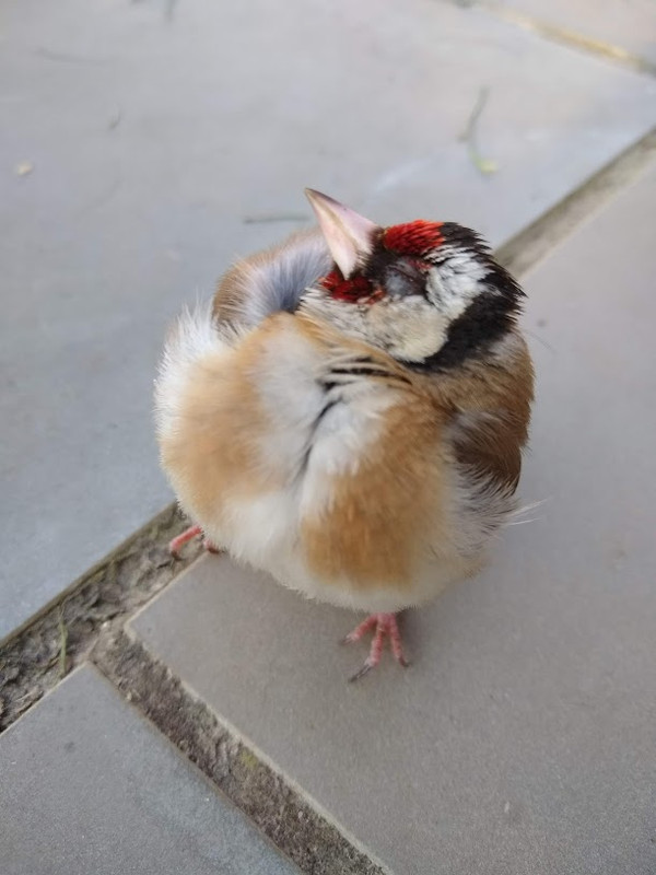 Hi all, been a while since I've been on - still planning next year's upgrades! Just a quicky, but we have an odd situation with a goldfinch fledgling that has turned up on our patio. I know that the advice is always just to leave fledglings, and probably also true in this case but I thought I'd seek the wisdom of the forum anyway. This young chap turned up about two hours ago, not walking brilliantly but I think it might just have been that s/he couldn't grip the patio very well. Anyway it has now gone to sleep, head tucked under wing and is standing about a foot from the door. It has literally been static for two hours with no sign of the parents at all (I didn't even know we had a local goldfinch nest, but we do get quite a few in the garden). Leave well alone? I'm keeping the dog inside for now, and although I doubt he'll kill it he will probably be curious (12 year old collie). Also this kind of assumes that this is a fledgling - seems very fluffy and unsteady - but perhaps not? Is colouring the same for young GFs? If not I suppose it could be a sick older bird. This was how he started - now with head under wing:  This close to the door!