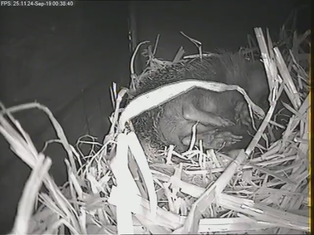 Lola had two naps lastnight the usual hour one, then she came again for 20 minutes later for a 20 minute nap. The pic is her on her 20 minute nap just before she got up. Exciting news too the other hog house has had an occupant, not sure if it was Lola or Gramps. Paul I got some good footage last night, lovely clear pics and videos, only downside I find is the IR is concentrated in a circle in front of camera,and doesn't pick up every movement straight away, Also on the photos it took it displays the temperature and moon phase, apparently at 3am it was 26c, not sure that is the camera temp but definitely not the outside temp.