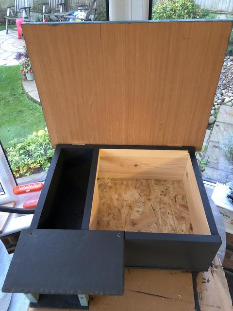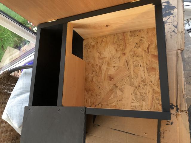 It certainly is addictive Karen, I kept looking at my phone during the night to see if a hedgehog had been in the house. I was a bit tired at work today  I didn’t get a visit last night, so that is 2 nights on the trot I haven’t seen a hedgehog. I have put one of the houses I made outside this evening with food only in it. A cat ate all the food last night. Matt, here is a photo of inside. I have only painted the ‘hallway’. I wasn’t sure what to do about the other bit, so left it untreated. I have used the Cuprinol shade. It was paint left over from the bird boxes    This is how I have set it up with for tonight. I have 2 bowls inside, one with cat foot and one with spike food and a bowl of water outside.