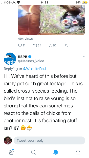 Wow, this is absolutely amazing Paul. So pleased RSPB have replied, but think you should also get in touch with Springwatch, this surely would be of great interest to them. You really are our Dr. Dolittle, the animals and birds seem to love you.  Keep those videos coming, so cool. Sue