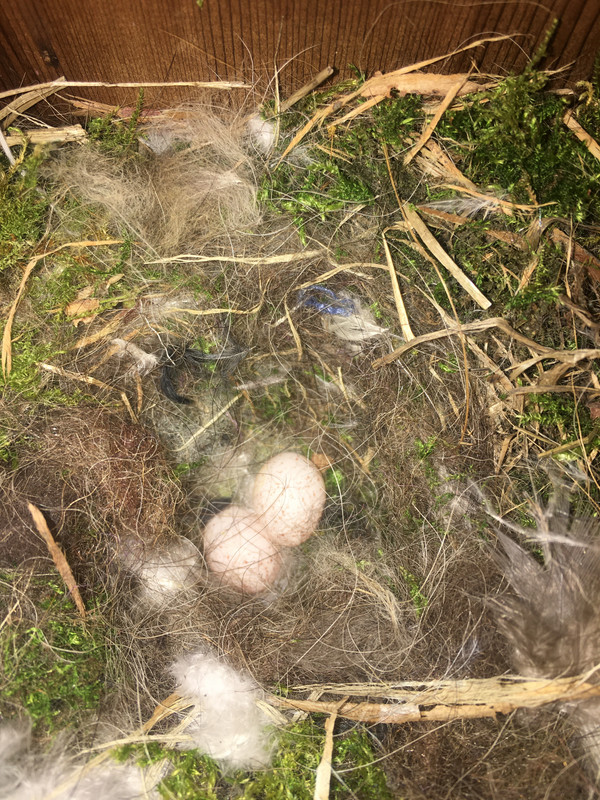 Guys... I cracked again like I do every year, Climbed up to the tree box and opened it up to check under the wool  dolly's got two eggs so far, So she must of started laying yesterday. She's kept them well hidden though off the camera let me tell you  She isn't doing that to me when I paid good money for that camera box! Recovered the eggs now! Update on the other blue tits, 100% two females, They are keeping most the material in now thank god, But still a long way to go before that nest is complete. Still no eggs for sparrows, Nest fully complete now female roosting each night. Here's is dolly's two eggs.