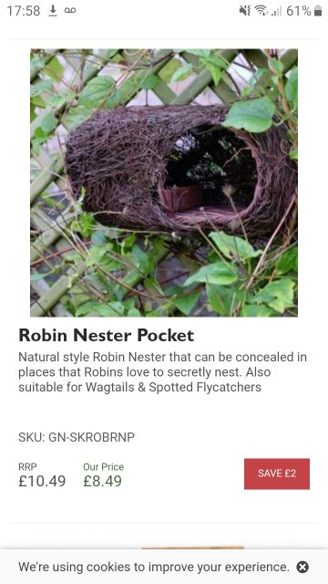 Ah thanks for the advice!! Ok, while it will have some cover when the clematis gets thicker, its not enough right now.... time to move my robins box...mine is wooden open fronted type with an apex roof (another Aldi special from 8 years back) Anyway, we have a number of these "bird loungers" wicker baskets hanging on the shed, left there from our previous owners....they used them for decoration. I guess I know what I'll be doing later on. (Yes, its 4am....I can't sleep.). I'm going to start find good spots to hang these guys around the garden.