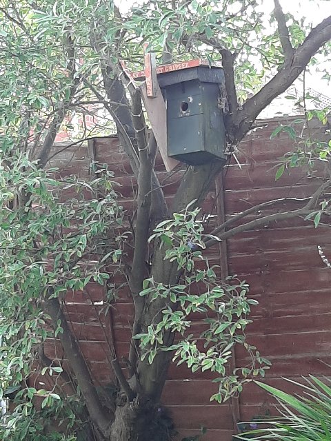 Hi Taz, Really sorry to read this about the cat attack on your birdbox...the little f*cker. Guys, I love cats & would never do them any harm, and sure you know the recent conundrum I got myself because of it, but I'm beginning to really turn against them...cannot understand their wanton wickedness. Especially when it is not for survival, which at least would allow me to forgive them. Taz, without showing or revealing anything private at your home, I wonder could you post up a picture of the location of your box? I'm just curious as to how they can get up to the entrance hole and for us all to see the pitfalls. My box is not too far up on the side of a wooden shed, and since Spooky has been re-homed, there are now two uninvited, large male cats prowling our garden regularly. Not happy at all about it one bit.  This is our box  The cat sat on the v to the left of the box. The cat climbed onto the tree again today, but we didn't let him stay too long 😂