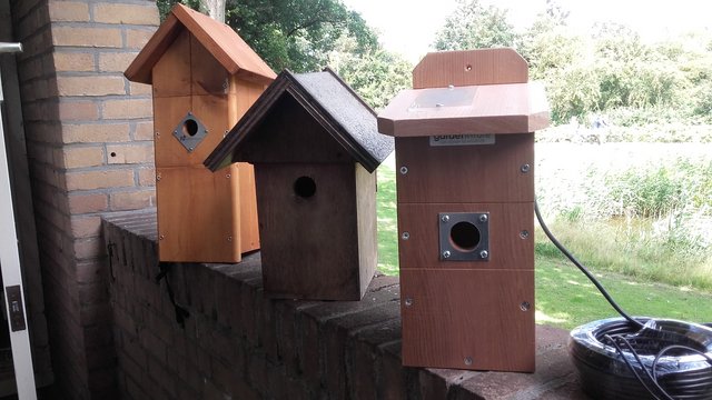 Hi all, Some time ago I bought the big box from Green feathers, a beautiful box, and also a camera for TV from them. Also the led light. Negative was the camera has no audio and I bought also a microphone from them. A lot of cabling outside the box is not nice to see. The box is placed against a wall so nothing you can put the cables behind. I dont like the view. I am now looking to gardenature for a box and camera. They have some plas5tic in their boxes where you can put the cables behind, which box is the best for this you think ?, the flat one or the one with the pitched roof, also I want the led light in the box, what is the best place for that, is that possible with these boxes? ? . Or use the box from green feathers and bought the camera from gardenature with the camera cabling for a big part in the nestbox ? Hope you can give me some ideas, thanks already  Hope you all do fine, greetings Tom.