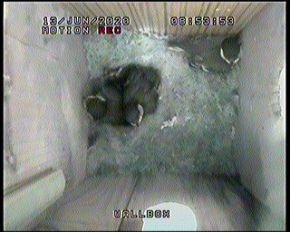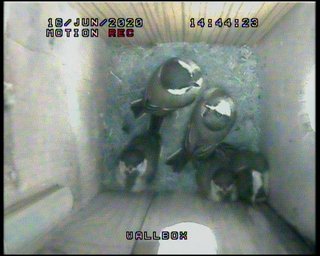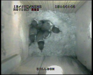 I wish a few more would get those wings beating as there are one or two cobwebs appearing in the attic and one in particular is beginning to spoil the view. A concerted effort by two or three could dislodge it, otherwise we'll have to wait until nearer fledging day when they start flying up into the rafters to get shot of them!