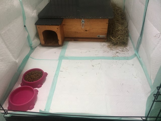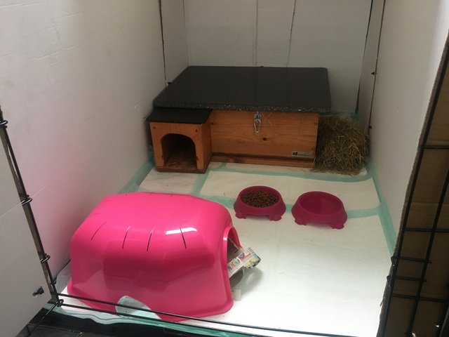 Amanda, Its an XXL dog crate / cage its 121cm long, 75cm wide and 80cm high. Only one each cage, I wanted to give her a big cage so she can move about and have a proper house! Karen, I'll see how I get on with her, Maybe i'll take another 1 or 2 you'll all be first to know anyway! I have changed the cage today, I have thick rubber sheets due to deliver Friday to put around the cage inside to stop her climb and maybe hurting herself. As you can see from the pictures, I had puppy training pads along the sides but Angel destroyed them  so its been updated to cupboard now until the rubber sheets come Friday. This little video did make me laugh though, She looked so innocent until lastnight! Heres how the cage is looking this morning after a clean and the cupboard down the sides, Also got her a Large rabbit den from Pets at home for £6 and put some newspaper in rescue told me it helps with the boredom for them and they will also used it to toilet in instead of the house.
