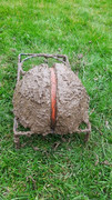 Oh Happy Day!!! Visits resumed this morning, and new material has been brought in....nest building has finally resumed in the long view box. Nothing new in the sideview box. I've relocated the open front Robin box now to East facing side of the wooden shed, in among a re-located mature Glasnevin bush (Solanum crispum)...which will hopefully create great coverage very soon if I haven't killed it. Its a bit sparse at present so chances of a nest this year are slim!  My homemade swallow/martin boxes will be ready in a few days...as I didn't have cement or plaster of paris (nor can I get some in this current Covid 19 climate), I decided to make the 'nest cups' out of a thick mixture of moss, twine and real mud, placed onto a small ball, so its needs a good few days for the mold to set hard. Going well so far though. Watch this space. Here are my two nest cups molds drying on the ball - I put the ball onto a double dog bowl holder that I conveniently found in the hedge while also looking for a ball!!!: