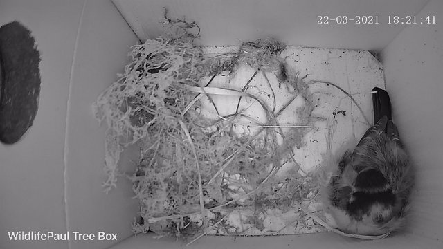 They literally check out everywhere Matt, Natural sites, boxes, you name it! Just lucky that she is going between 2 of my boxes and roosting in one. Shes brought a fair bit of material into the tree box today though, Last material to come in was around 4:30pm. So fingers crossed its the sign of more serious building! Here is she roosting