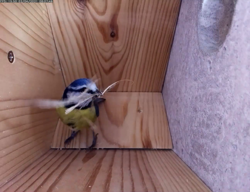 Nothing Paul, apart from she did land outside the sideview this morning and look inside the hole, but didn't go in. It has been an absolutely glorius day, as well - sunny, no wind. All change tomorrow, perhaps they can sense that? But lots of other birds flying around with nesting material (sparrows and starlings), and the great tits have been busy on a ball of dog fluff I hang up for them, so they must be almost done nest building somewhere.
