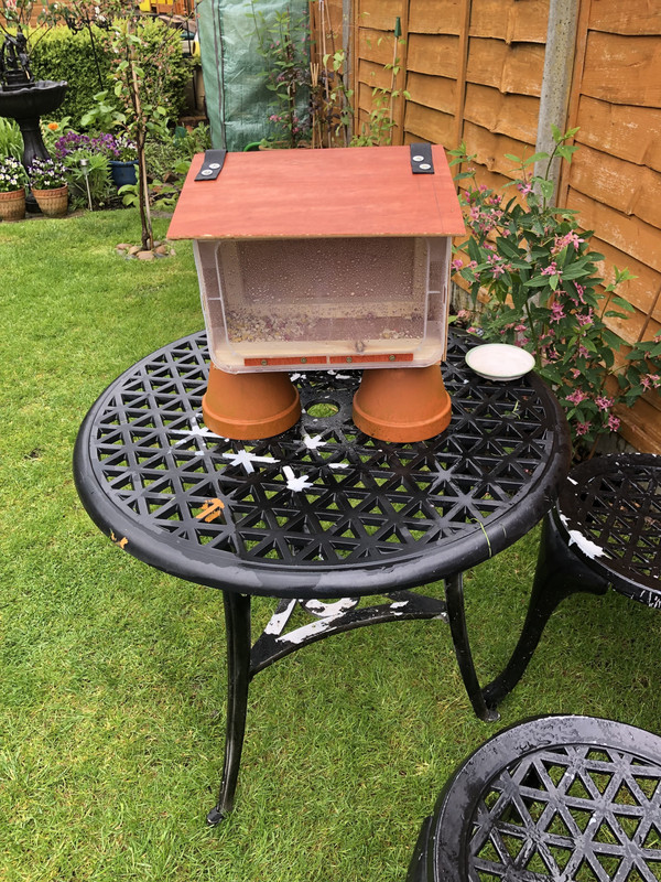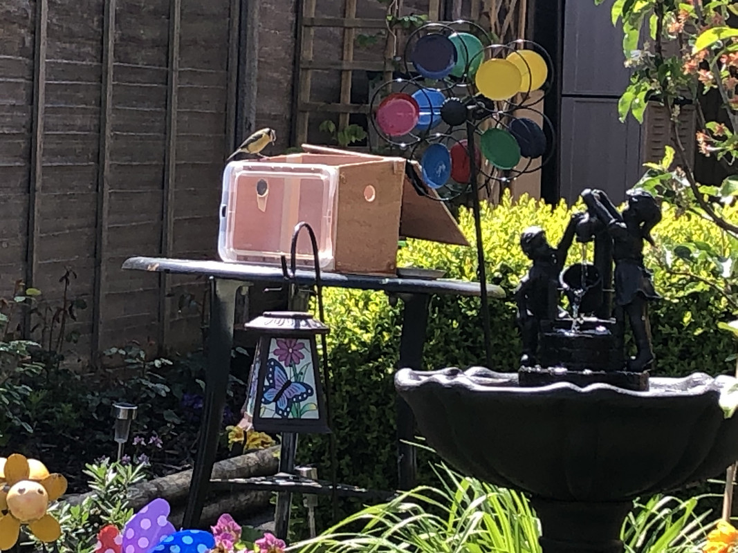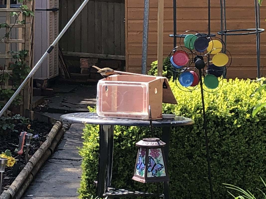 The birds are finishing a full feeder so quickly I filled it up in the evening yesterday. Mainly sparrows but still blue tits great tits and robins No sign of a bird now they know it’s empty new box on table below and no takers for any going in robin has just attempted it will take a few tries and work it out I’m going to wait until tomorrow to top up the feeder it’s the only way I stand a chance for the box to be used im must stay with the plan and hope it works on a positive note robin and great tit have found the suet cage feeder so they aren’t without food  hubby has just made holes a bit bigger hopefully it works  finally a great tit has been through the hole and found the food
