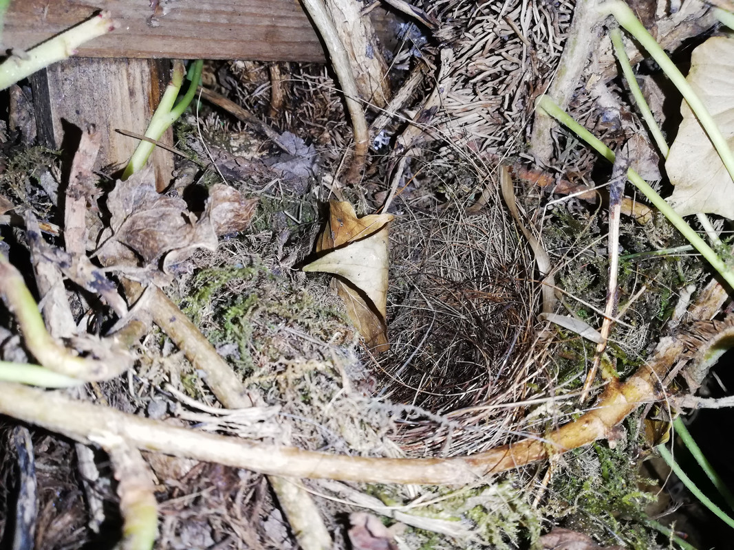 Sad to report I found one dead robin chick on the lawn just now. It didn't look developed enough to be a fledgling. We haven't seen the parent birds at all today. With no noises coming from the ivy I decided to have a closer look - sure enough I found the nest ... It's empty. It looks hardly big enough to accommodate anything the size of the dead chick I found, so it's hard to imagine there being a whole brood in there. I'm guessing it was either predated by something (magpie? cat?), or the rest of the brood fledged today despite the rain, and the under-developed dead one I found was just an unfortunate late developer who didn't make it. Here's the nest: