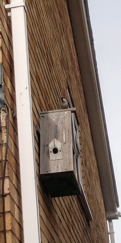 Ok the mystery of the chirping sparrow has been solved! we have a claimant on the triple nest chamber I have on the side of the house, caught him going in the central hole at the front of the box yesterday with a bit of material sadly there is no camera in this box, I don't think he is paired yet due to the racket he has been making but will see if I can spot a female at some point! it's funny as I had originally put this box up in 2016 for sparrows but none ever went near it though the first year we did have a bluetit nest and then it was used for roosting only by bluetits in the subsequent years. Managed to snap this pic of him at the box yesterday: ![]()