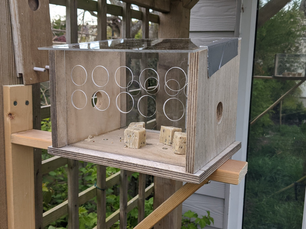Pete, here's the contraption I cam up with for feeding mealworms last year. This pic is from the "training" phase pre-chicks, when I was trying to get them used to it. In this early period, they never did manage to get through the holes so I swapped one side out for a horizontal row of bamboo (kebab type) skewers, spaced close enough together to keep the starlings out. They were straight in then, and once they got used to it I swapped the perspex hole side back in and they were happy enough going inside. Absolutely no chance for bigger birds, although that didn't stop them trying!