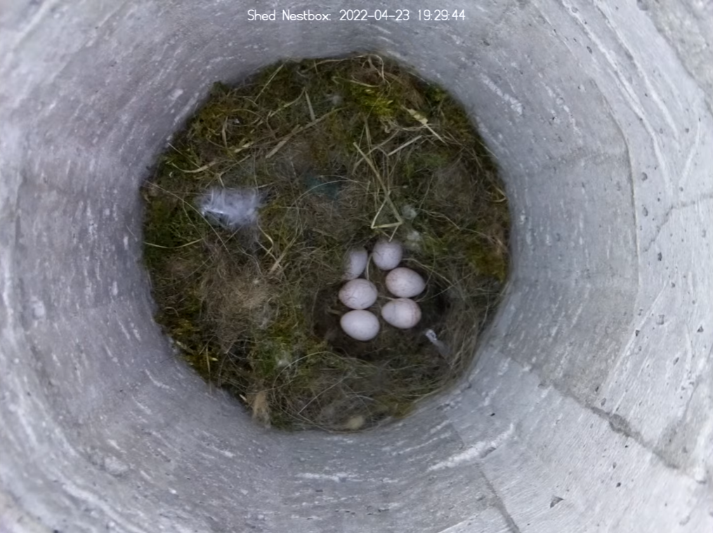She's continuing to lay an egg every morning, but getting a clear view of the eggs has proved tricky. She has a very messy nest and covers everything in the morning with just a chance of a glimpse early morning or late afternoon. This morning I got a very quick view of 6, which is what I expected to see but hadn't been able to confirm for a few days: