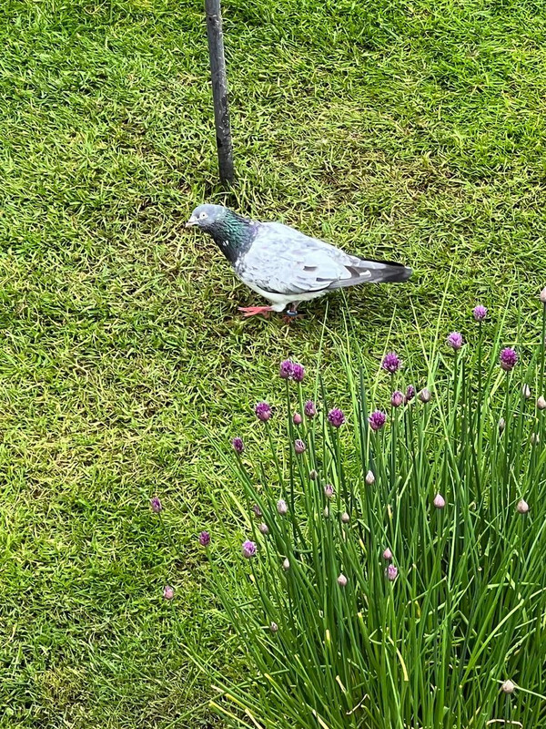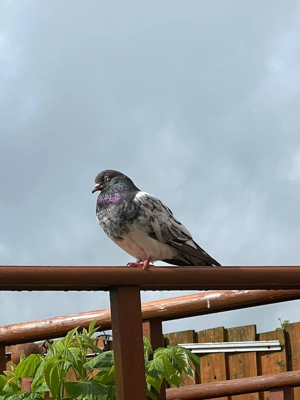 12 days ago this racing pigeon appeared in our back garden and fed on the spilt sunflower hearts dropped from the feeders. We thought it would feed up, rest and be on its way but it is still here and seems happy feeding and roosts on a hanging basket metal bracket attached to the house. It has a rubber ring on its leg so must have been in a race. It puffs its chest out and makes a throaty call which means its a male. We therefore named it Percy. He is quite a good looking bird