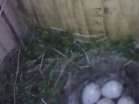 I am pretty sure the nest is complete now as I saw no material going in while there yesterday, she was putting the soft lining in on Thursday so think she is done. Wont really have any way of knowing the egg situation until she starts incubating